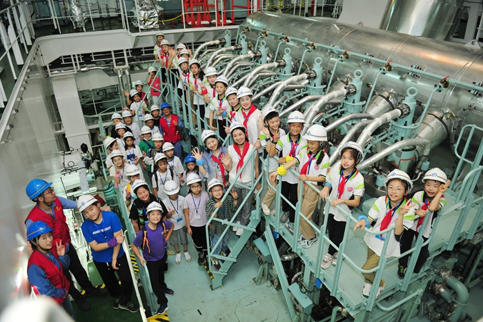 現(xiàn)場(chǎng)觀摩完壯觀的新船吉水儀式,“小小揚(yáng)船人”對(duì)船舶產(chǎn)生了濃厚的興趣。為了讓孩子們更直觀地感受剛看到的這艘龐然大物的威武雄姿,公司安排他們登上建造完工的同型2600TEU集裝箱船參觀。