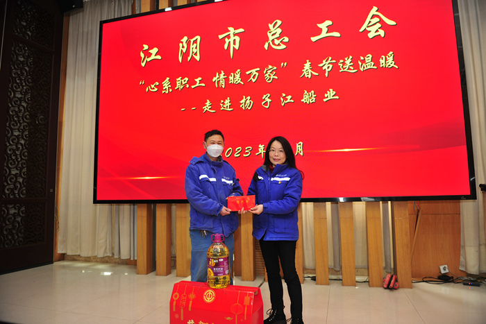 新?lián)P子造船總經(jīng)理助理茆宏兆為12月申請員工互助幫困基金的會員職工送上基金會的慰問。新?lián)P子造船總經(jīng)理杜成忠為困難職工送上慰問金和年貨。傾聽他們生活上的困難和對工作環(huán)境等方面的意見,寬慰他們困難只是暫時的,關鍵不能失去戰(zhàn)勝困難的信心,在自己的努力和公司多方位的關懷下,一定能夠走出困境,迎來美好生活。同時,杜總還為大家送上了新春祝福,祝愿大家闔家幸福、新春快樂!揚子鑫福造船黨支部書記陳金爐、工會主席陳紅代表公司和工會為困難職工送上慰問金和慰問品。揚子三井造船黨支部書記鄭紅星、工會主席司凌鈺代表公司和工會為困難職工送上慰問金和慰問品。