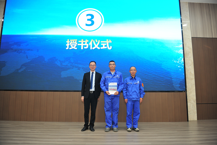 本期特訓(xùn)營的產(chǎn)出已匯編成冊,百仕瑞高級講師顧晨毅老師、新?lián)P子造船副總經(jīng)理倪榮對新?lián)P子機(jī)電車間電工四班班長陳亮進(jìn)行了授書儀式,隨后陳亮介紹了手冊內(nèi)容及意義。