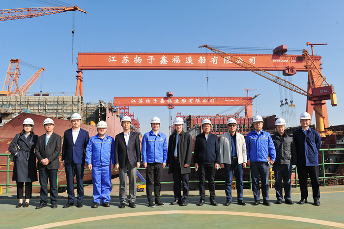 董事長(zhǎng)任樂(lè)天、副總經(jīng)理張濤陪同胡賢甫總經(jīng)理一行參觀了揚(yáng)子鑫福造船生產(chǎn)現(xiàn)場(chǎng),任董詳細(xì)介紹了揚(yáng)子江船業(yè)的發(fā)展歷程和當(dāng)前的經(jīng)營(yíng)形勢(shì)。登上揚(yáng)子鑫福塢門,揚(yáng)子鑫??偨?jīng)理?xiàng)钛檎猩叹止I(yè)一行領(lǐng)導(dǎo)介紹了塢內(nèi)在建船舶的基本情況和建造進(jìn)度。