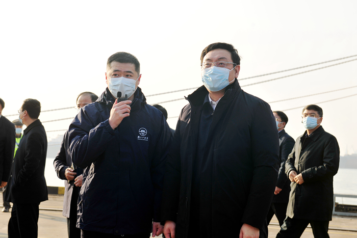 碼頭上豎起的展板上展示了新?lián)P子造船的一個個“硬核”產品——9150DWT電推動力油化船、全球首制的83500DWT油散化(OBO)組合兼裝船、國內首次采用C型罐作為超大型箱船燃料罐的14000TEU雙燃料集裝箱船等,這些具有完全自主核心技術的“巨無霸”,彰顯了新?lián)P子造船的硬核實力。萬聞華市長勉勵企業(yè)持續(xù)拓展市場,推進自主創(chuàng)新,進一步鞏固企業(yè)在高科技船型設計建造領域的領先優(yōu)勢。