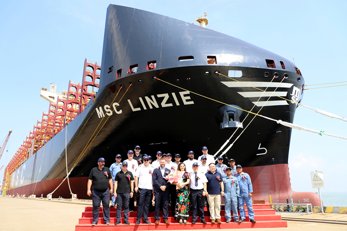 9月4日,我集團與地中海航運共同為新船舉行了命名祈福儀式。命名人Martyna Orzechowska女士,地中海航運新造船部門駐揚子鑫福現(xiàn)場辦經(jīng)理羊海濤先生,我集團總經(jīng)理助理兼揚子鑫福造船總經(jīng)理楊雪彥先生,挪威船級社江陰站靖江部門經(jīng)理莊華平先生,以及船東監(jiān)造組、船檢、船廠、船員相關(guān)人員代表及嘉賓出席了儀式。命名人Martyna Orzechowska女士將新船命名為“MSC LINZIE”輪,為新船砍纜、擲香檳禮、拉響汽笛,并與船長共同在新船畫框上署名留念,祝福隨船船員航行平安,為船東和租家?guī)順s譽和財富。