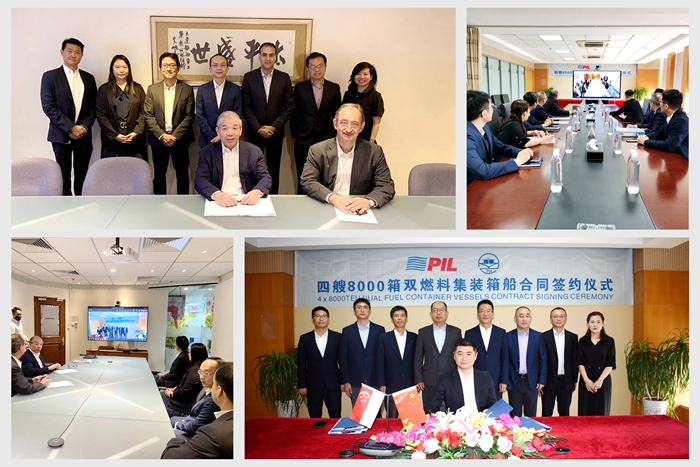 7月5日,我集團與新加坡太平船務(wù)(PIL)簽訂了4艘8000TEU液化天然氣(LNG)動力雙燃料集裝箱船訂單,雙方代表通過“云簽約”方式完成合同簽署。