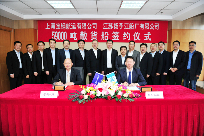 ▲11月13日下午,我集團(tuán)下屬江蘇揚(yáng)子江船廠有限公司與上海寶鋼航運(yùn)有限公司簽署了2艘59000噸散貨船新造船合同。集團(tuán)董事長(zhǎng)任樂(lè)天先生,寶鋼資源(國(guó)際)有限公司董事長(zhǎng)張典波先生,寶鋼資源(國(guó)際)有限公司總裁陸克從先生,我集團(tuán)副總經(jīng)理宋書(shū)明先生,副總經(jīng)理杜成忠先生,以及來(lái)自寶鋼資源、寶武原料、寶鋼航運(yùn)、中聯(lián)海運(yùn)、上海船舶研究設(shè)計(jì)院、中國(guó)船級(jí)社等領(lǐng)導(dǎo)和重要嘉賓出席簽約儀式。