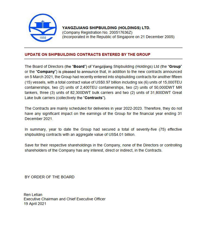 4月19日,上市公司發(fā)布公告,集團最近簽署了15艘、總價值達9.7億美元的新船建造合同。15艘新造船舶包括: