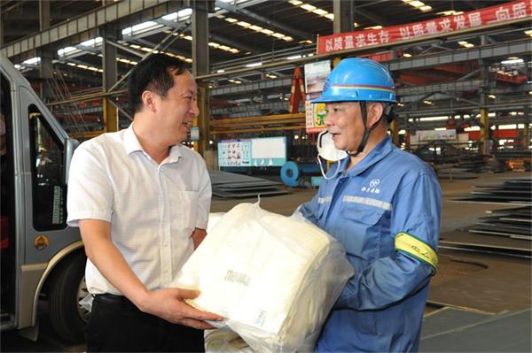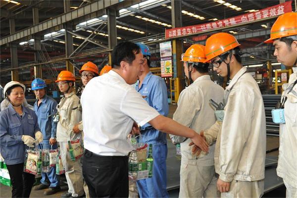 胡榮華副主席帶隊慰問了在高溫下堅守工作崗位的新?lián)P子加工車間員工,給他們送去防暑降溫物品,他代表市委、市政府向頂著烈日奮戰(zhàn)在一線的全體工友表示慰問。之后,市總領(lǐng)導(dǎo)一行還對我集團(tuán)上半年度工會工作進(jìn)行了調(diào)研。在聽取工會王主席對我司上半年主要的工會工作和職工活動介紹后,胡副主席用“四個有”評價了我們的工作,即“企業(yè)發(fā)展有條不紊、工會工作井井有條、活動開展有聲有色、服務(wù)職工有心有愛”當(dāng)天,市總共為我們送來了400條毛巾和5箱礦泉水的慰問品。