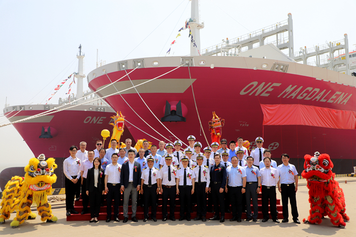 On the morning of June 17, "ONE PARANA"were christened in Taicang factory the same day together with "ONE MAGDALENA" of the same batch. On June 21, 2022, the online Delivery Ceremony of "ONE PARANA was held betweenianSeaspan and our Group. The ship was delivered 40 days ahead ofcontractual delivery time.It is worth mentioning that this project isunderwritten by Sinosure and adopts the world's first ECA+ daily tax leasefinancing structure. Sinosure and the syndicate have made concerted efforts toobtain a higher financing ratio with a lower financing cost for the shippers.All parties have realized the efficient implementation of the project withinnovative thinking and professional spirit.